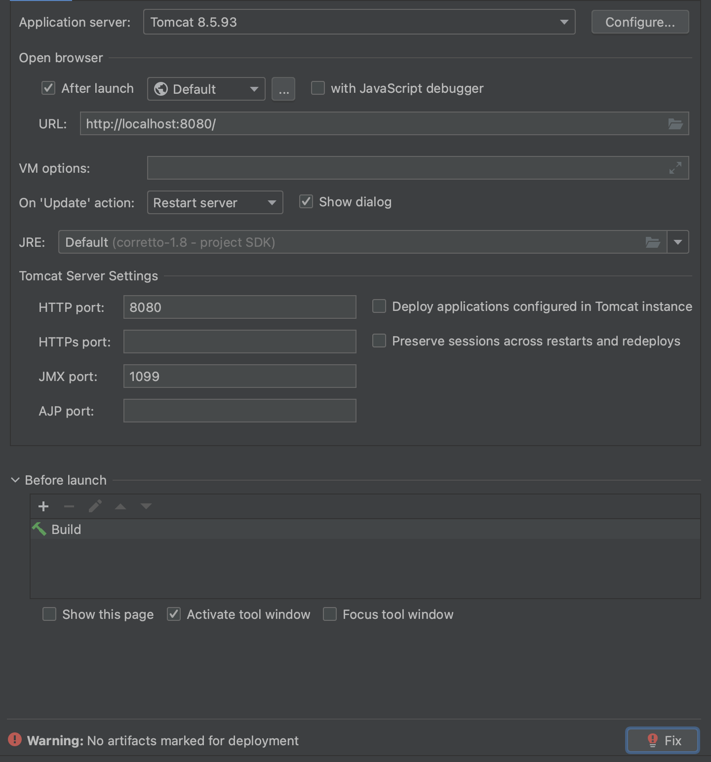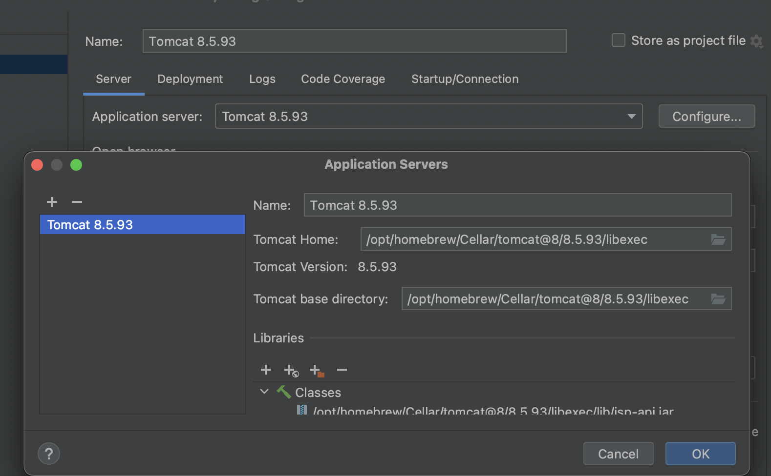 3. application server 옆의 configure 버튼을 클릭하여 tomcat 경로를 /opt/homebrew/Cellar/tomcat@8/8.5.93/libexec로 설정, 그 후 ok 버튼 클릭